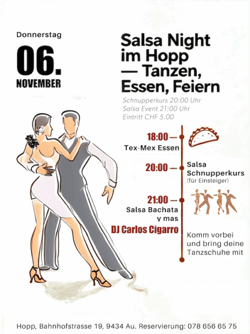 Ein Abend voller Salsa, Bachata und guter Stimmung: Erst kulinarisches Tex‑Mex, danach ein kostenloser Schnupperkurs für Einsteiger und anschliessend Dancefloor‑Feeling mit DJ Carlos Cigarro. Egal ob ihr tanzen lernen oder einfach nur die Atmosphäre geniessen wollt — bringt eure Tanzschuhe mit und lasst euch mitreissen.