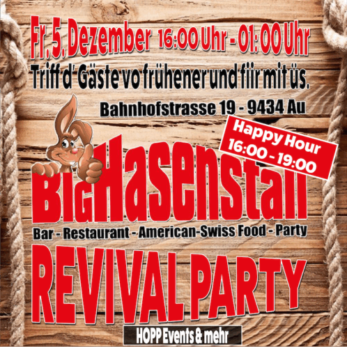 Wir laden euch herzlich zur grossen Revival Party ein, bei der wir das Beste aus zwei Welten vereinen: früher das legendäre Big Hasenstall, heute euer gemütliches Hopp. Feiert mit uns den Neustart und stoßt an auf altbekannte wie neue Gäste!